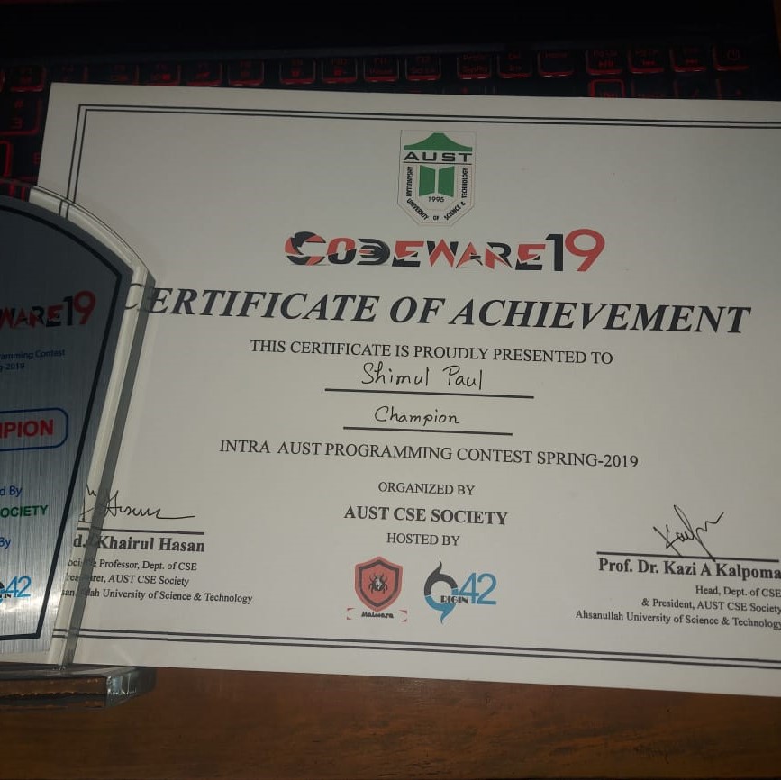 CHAMPION in Programming Competition, Codeware19 (INTRA AUST PROGRAMMING CONTEST)