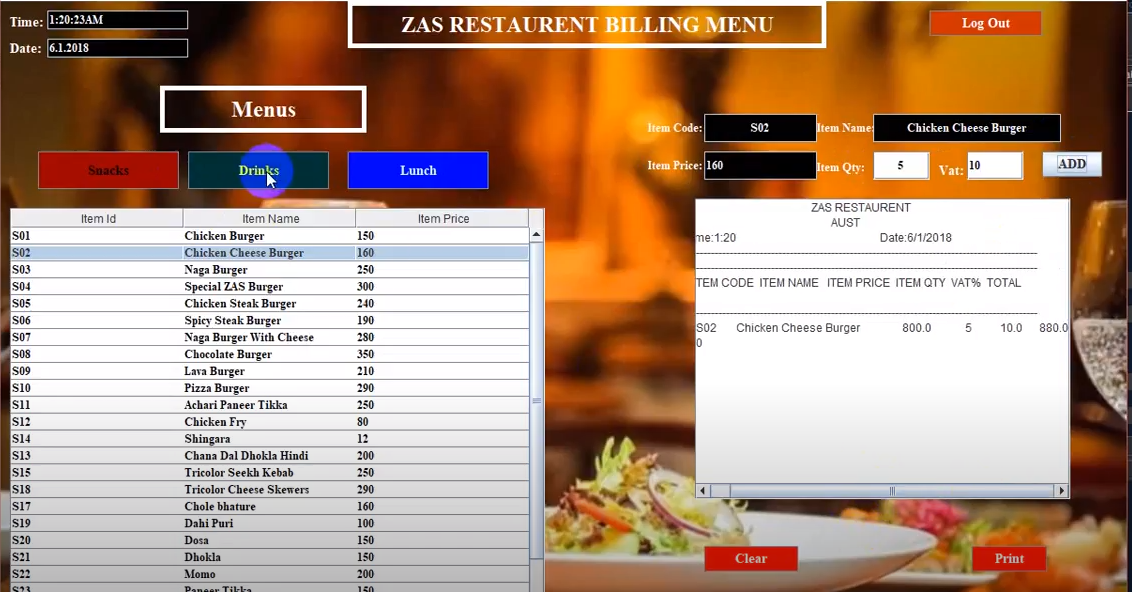 This project(Restaurant billing management system) made with the help of java,mysql .In the system some specific users can log in and generate the bill only by providing the item's quantity and vat percentage. The bill can be printed as a token. Only the main admin can add or delete users by id from database by logging in. He /She can also add or delete food item from the database.
