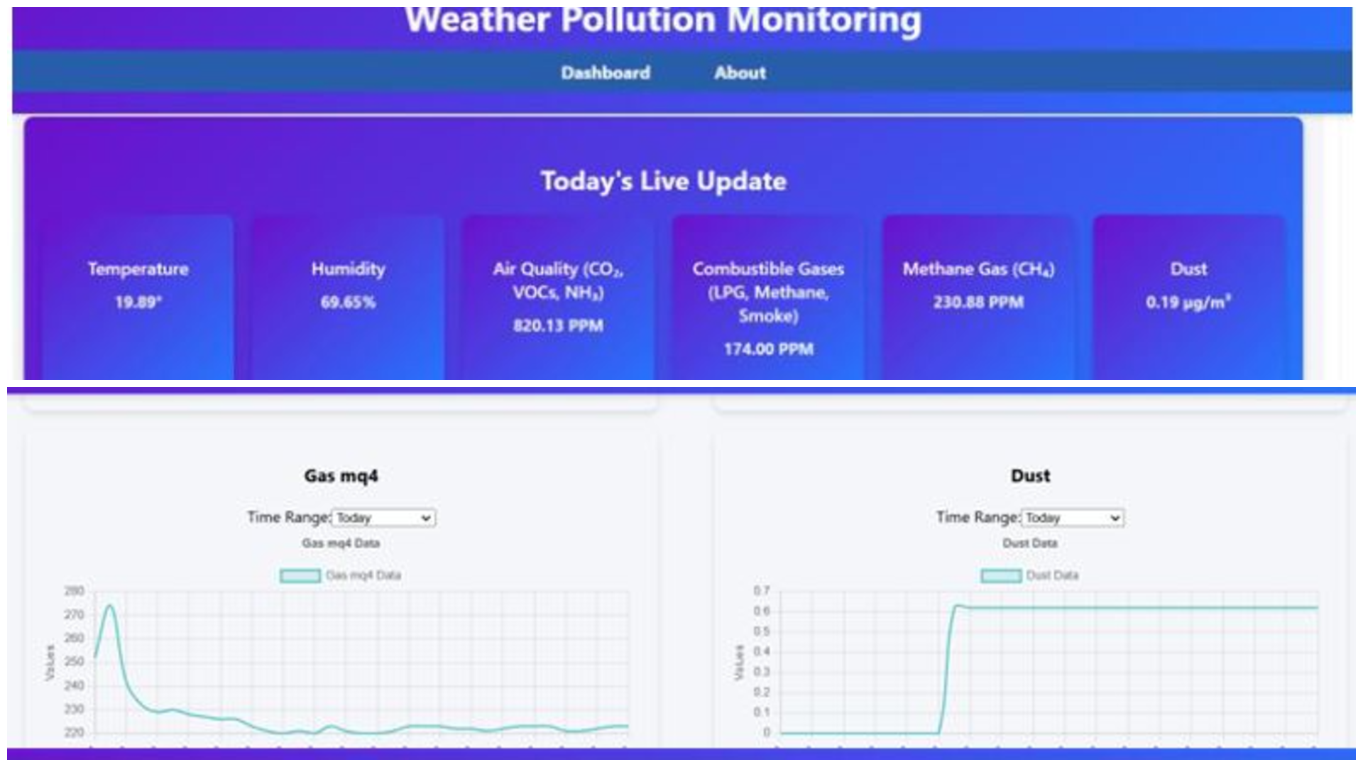 This project introduces a real-time, low-cost IoT-based weather and pollution monitoring system using ESP32 and environmental sensors. With a Django-MySQL backend and a React.js dashboard, it enables live data visualization, historical analysis, and instant alerts via email and SMS. Deployed via Docker, the system supports smart city, healthcare, and agricultural use, promoting data-driven decisions and sustainable urban planning.